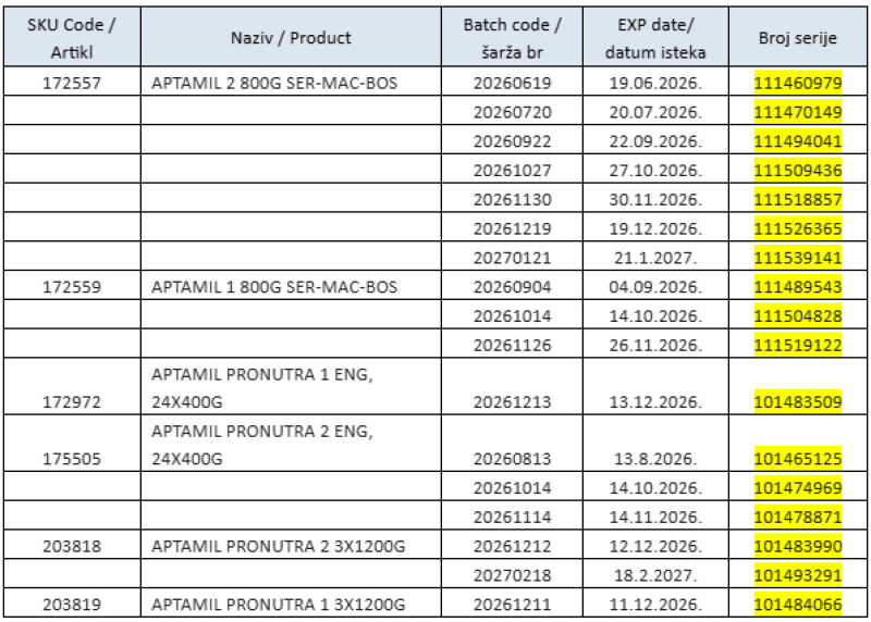 Agencija je zaprimila i obavijest tvrtke Euromand doo, Varaždinska 2, Široki Brijeg, o preventivnom povlačenju određenih serija formula za dojenčad sa tržišta BiH, a na temelju informacija tvrtke Danone, i to: