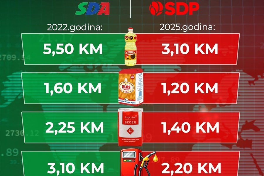 Socijaldemokratska partija Bosne i Hercegovine objavila je grafiku u kojoj poredi rezultate rada aktuelne Vlade Federacije BiH s periodom 2022. godine, kada je vlast u FBiH predvodila Stranka demokratske akcije. Fokus poređenja stavljen je na cijene osnovnih životnih namirnica, goriva, visinu minimalne plate i penzije, kao i na inflaciju.
