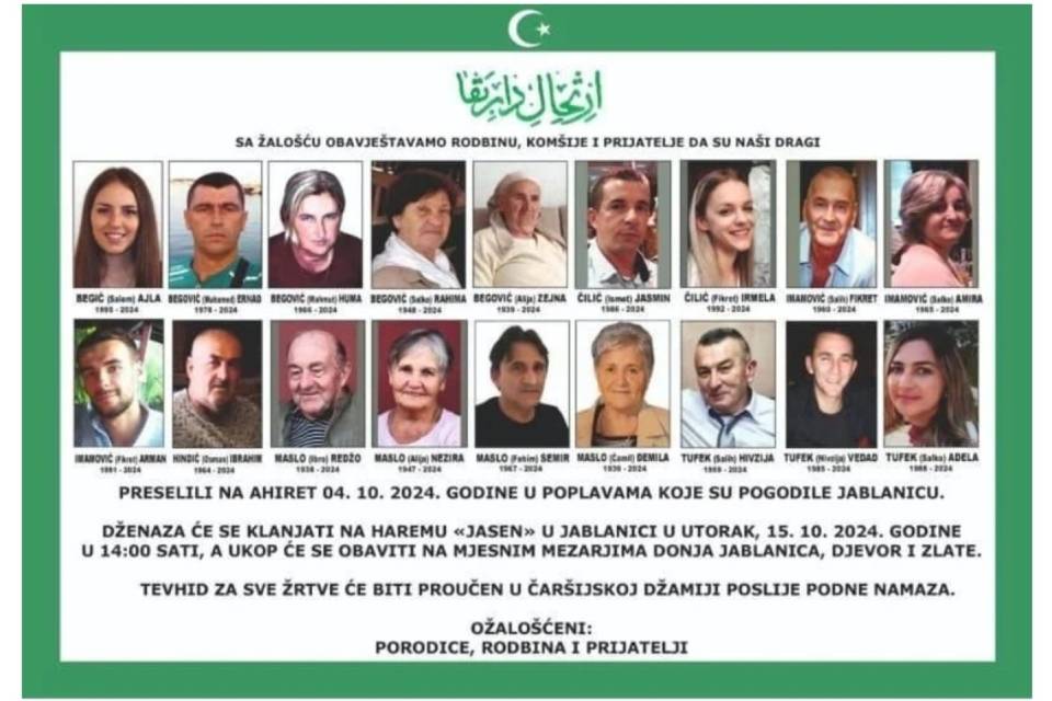 Podsjetimo, tog 4. oktobra su smrtno stradali: Begić (Salem) Ajla 1995-2024., Begović (Muhamed) Ernad 1978-2024., Begović (Mahmut) Huma 1966-2024., Begović (Salko) Rahima 1948-2024., Begović (Alija) Zejna 1939-2024., Čilić (Ismet) Jasmin 1986-2024., Čilić (Fikret) Irmela 1992-2024., Imamović (Salih) Fikret 1960-2024., Imamović (Salko) Amira 1965-2024., Imamović (Fikret) Arman 1991-2024., Hindić ( Osman) Ibrahim 1964-2024., Maslo (Ibro) Redžo 1938-2024., Maslo (Alija) Nezira 1947-2024., Maslo (Fehim) Semir 1967-2024., Maslo (Ćamil) Đemila 1939-2024., Tufek (Salih) Hivzija 1959-2024., Tufek (Hivzija) Vedad 1975-2024., Tufek (Salko) Adela 1988-2024.